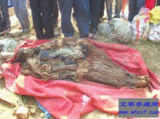 3、棺内,一具干尸形态怪异,且百年不腐。干尸的内脏并未被取出(木乃伊的制作,首先得将尸体内脏取出,以药物香料填满腹腔胸腔以防尸体腐败,然后再用药物浸泡过的布巾将尸体从头到脚裹得密不透风。