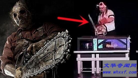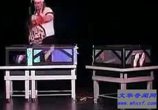 而且魔术开始后,魔术师首先将一块刀片从道具箱的中间切入,此时箱内的妻子一切安好,手脚都能动弹。随着魔术失误锯死妻子高潮的到来,魔术师手拿一把大电锯朝箱子中间拦腰砍下,魔术师还用手挠了一下妻子的脚掌。