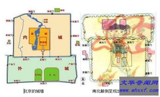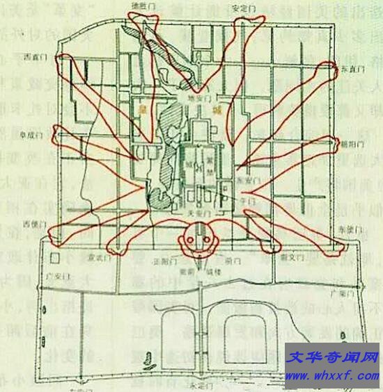 他把老北京内城正南中间的一座门叫正阳门,定为哪吒的脑袋。有脑袋就应该有耳朵,他的瓮城东西开门,就是哪吒的耳朵;正阳门里的两眼井,就是哪吒的眼睛;正阳门东边的崇文门、东便门、东面城门的朝阳门、东直门,是哪吒这半边身子的四臂;正阳门西边的宣武门、西便门、西面城门的阜成门、西直门,是哪吒那半边身子的四臂:北面城门的安定门、德胜门,是哪吒的两只脚。