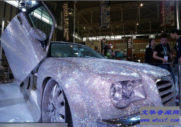 这款汽车讲讲一亮相就引起全网热论!他陈列在新增的改装车专区,吸引了众多的出瓜群众前来围观。这是全球唯一一款满钻克莱斯勒300C,上面的钻石全部都是手工镶嵌,整个车身也是经过改造的,内饰为定制。