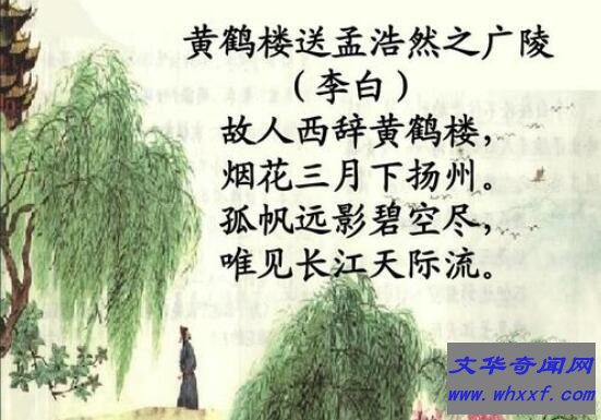 故人西辞黄鹤楼,烟花三月下扬州。孤帆远影碧空尽,唯见长江天际流。这首诗是唐代著名诗人李白所创,所写的诗比较雄厚飘逸,风格上比较奔放,富有浪漫主义精神。李白性格上十分风流倜傥、豪放不羁,喜欢游山玩水,喜欢尝遍天下美酒,后世人们称他为诗仙。