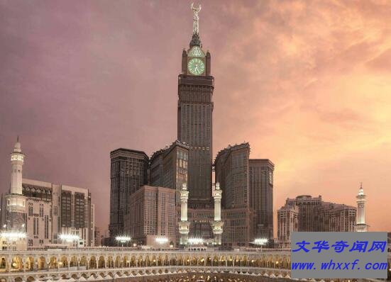 麦加皇家钟塔饭店坐落在沙特伊斯兰教圣城麦加,整座大楼高601米,建筑总面积150万平方米,楼层120。在最顶端用黄金制作一弯新月,距离四百米出建有四面钟,每面钟高80米,宽65米,直径40米,每当节庆日时候就会从钟塔上发射16条彩色光柱,真是绚丽夺目。
