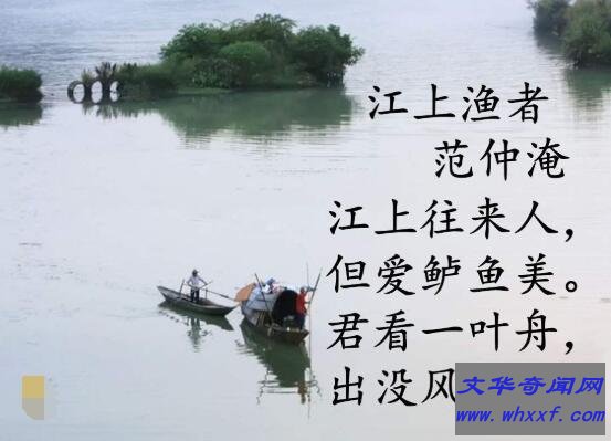 江上往来人,但爱鲈鱼美。君看一叶舟,出没风波里。这首诗是范冲淹于北宋景祐元年(1034年)所作,短短20个字形象生动抒发作者高远意境,通过描绘渔民劳作的艰苦,来唤起人们对民生疾苦的注意,充分体现作者对民间大众劳动人民的深刻同情。