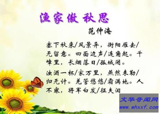塞下秋来风景异,衡阳雁去无留意。四面边声连角起。千嶂里,长烟落日孤城闭。浊酒一杯家万里,燕然未勒归无计。羌管悠悠霜满地。人不寐,将军白发征夫泪。诗人将将士们的英雄气概及艰苦生活描绘出来,突出一种寥廓荒僻、萧瑟悲凉景象,抒发作者思乡忧国的情怀。