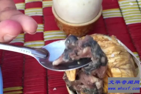 据说鸭仔蛋可以起到美容养颜的作用,在越南是妇女坐月子时的最佳补品,甚至还有人说其可以补脑和补肾,而鸭仔蛋确实富含蛋白质,有着丰富的营养,并且价格便宜,深受很多人的喜爱,但是因为鸭仔蛋的外形奇特,经常被全球许多美食评论家名列“全球最奇怪、恐怖、恶心的食物之一”。