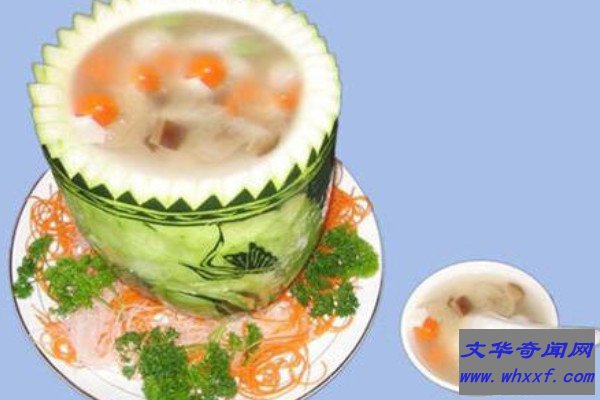 什锦冬瓜帽是广东一道传统名菜,它属于粤菜系,以冬瓜和猪肉为主要原料制作而成,它适合脾胃虚寒、阳气不足的人群食用,制作时以老熟的冬瓜为最佳食材。