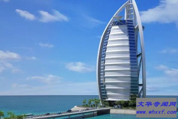 迪拜帆船酒店的高度为321米,一共有56层,建在离沙滩岸边280米远的波斯湾内人工岛上,顶部设有一个停机坪。据说在迪拜种植一棵树就要花费3000美元以上,其中有多个世界上最贵的酒店,奔驰在这里当警车用,金银首饰是每个女人的必备品,还有全球最贵族化的运动。