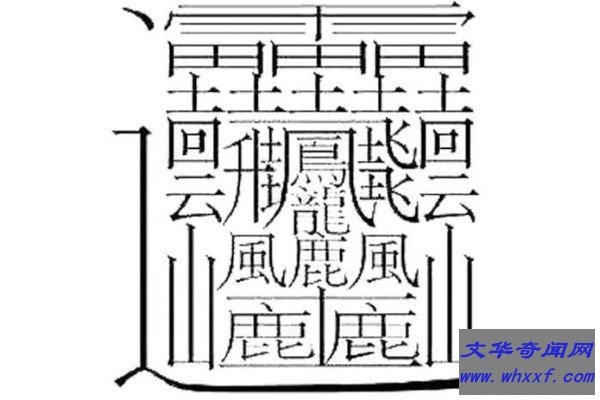 172画的汉字与其说是字,不如说是一幅画,也有人称它为一道符,首先从这个字的结构上来看,由一个雨、一个鳯、一个龍、两个四云、两个山、两个风、三个田,三个鹿、六个土代指雷电等诸多字体所组成,可以理解成霹雳惊雷,云波诡谲,龙凤飞升,大势将起,风啸山林,逐鹿中原。