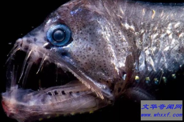 毒蛇鱼主要分布在全球的热带至温带海域,它们因为具有像毒蛇一样的毒牙而得名,身上分布有很多发光器,常常利用发光器诱捕食物,能一口吞下比自己大很多的猎物,这种鱼还有大大的圆眼睛,看上去就像恶魔一样。
